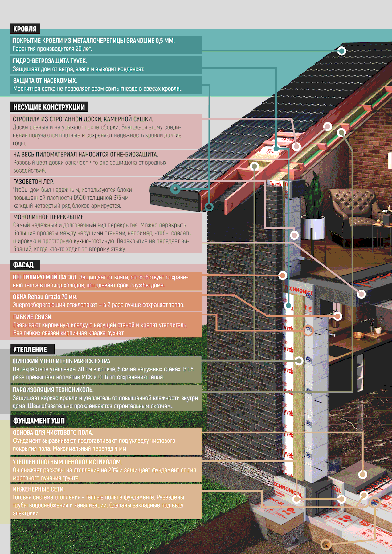 При соблюдении всех технологий строительства материал не выделяет токсичные вещества, не гниет, не подвержен возникновению плесневых и грибковых образований, не представляет интереса для грызунов и насекомых.