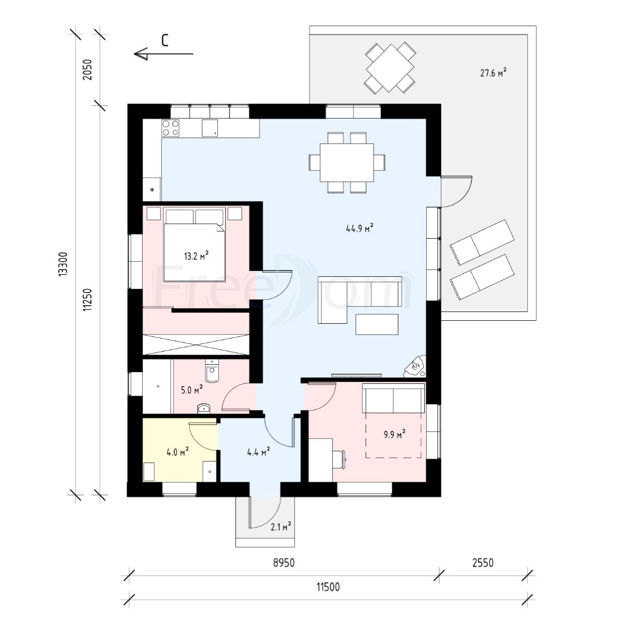 В кухне-гостиной выполнена отделка «под конёк» — высота потолков от 2.7 до 4 м., в комнатах 2.7.