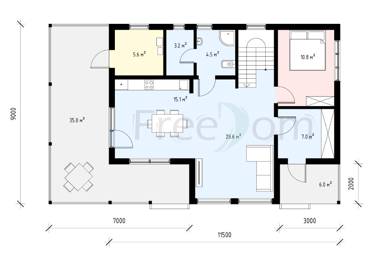 На первом этаже расположились общие пространства для отдыха с семьей и друзьями, приготовления и приема пищи, а также технические помещения, гостевая комната и санузел. Из гостиной с панорамным остеклением и вторым светом есть выход на террасу.