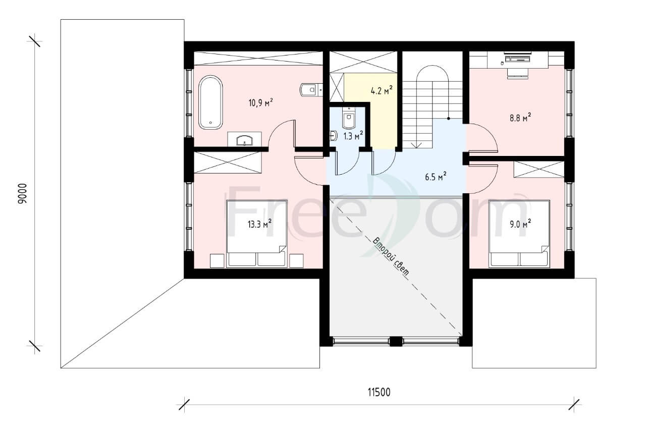 Второй этаж – это место для уединения и отдыха. Здесь находятся две спальни, кабинет и санузлы. Один из санузлов имеет большое окно напротив ванны, чтобы наслаждаться прекрасным видом.