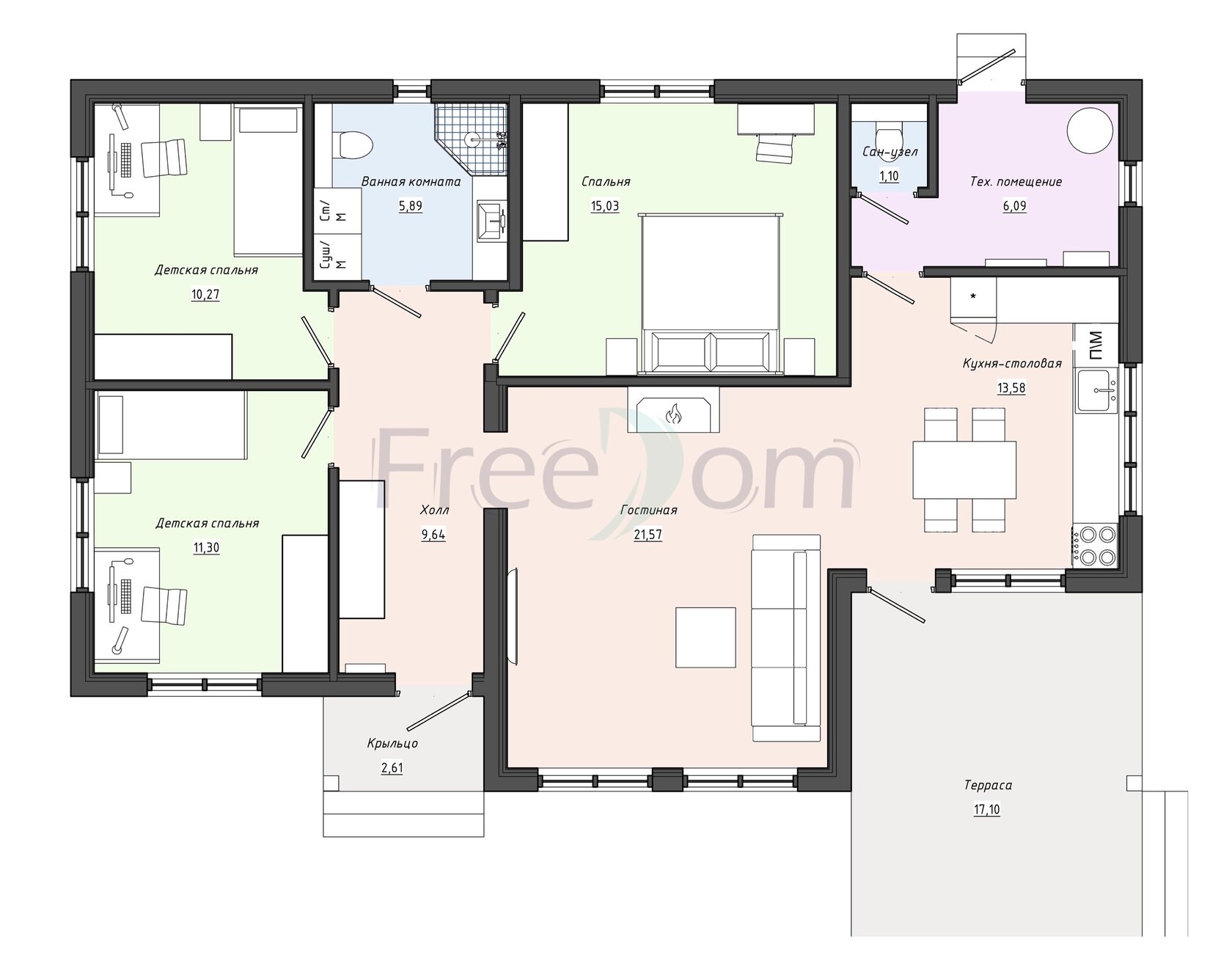 Кухня-столовая, гостиная, 3 спальни, 2 санузла, техническое помещение, терраса.