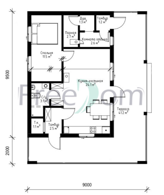 Кухня-гостиная, спальня, санузел, парная, терраса.