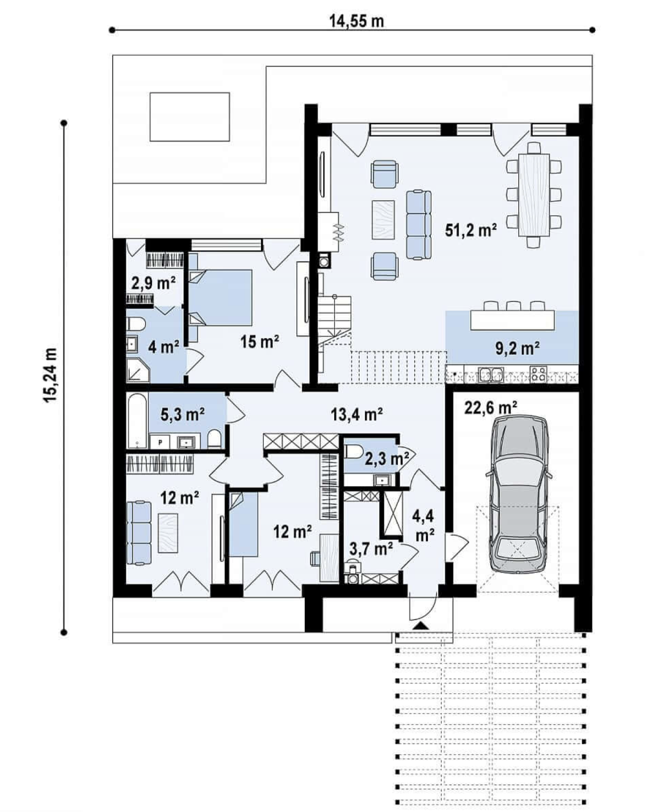 Большая кухня-гостиная, четыре спальни, три санузла, терраса, гараж.