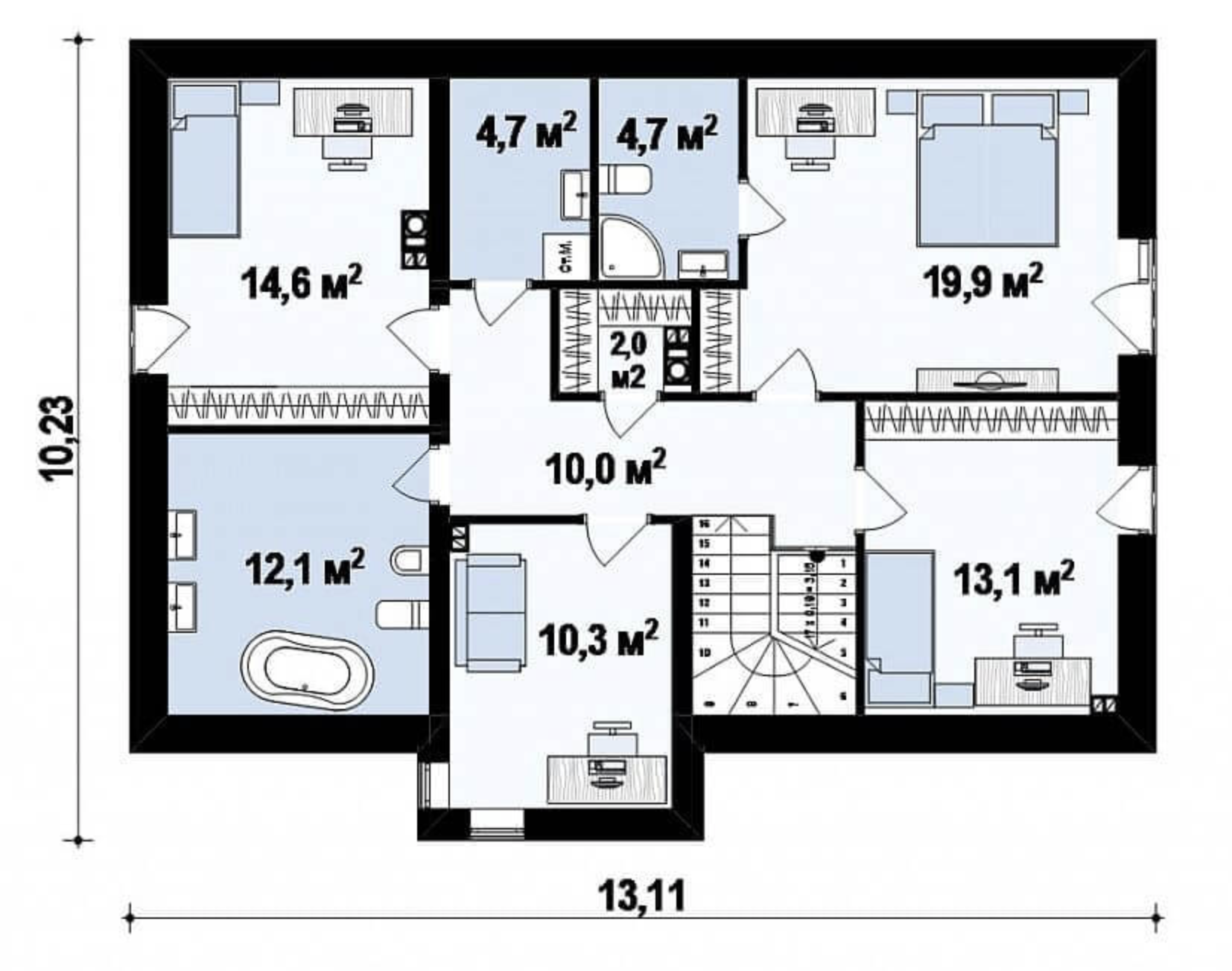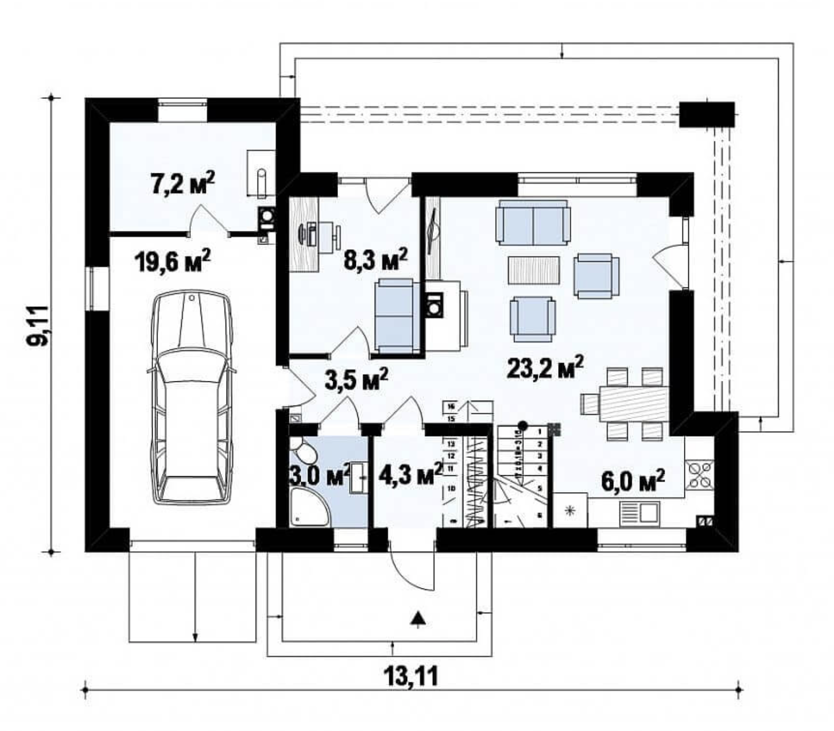 Кухня-гостиная, пять спален, три санузла, терраса, гараж.
