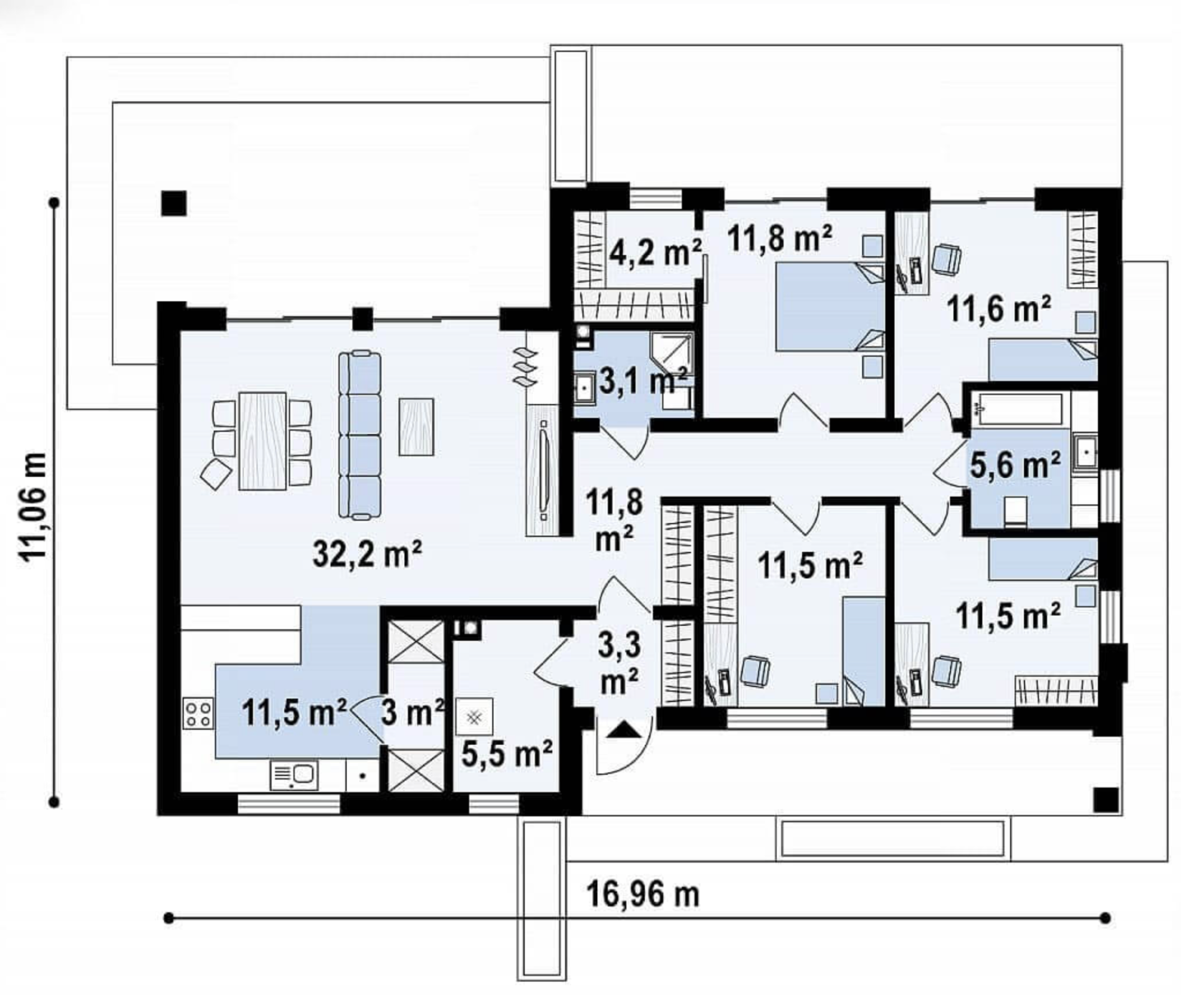 Большая кухня-гостиная, четыре спальни, два санузла, терраса.