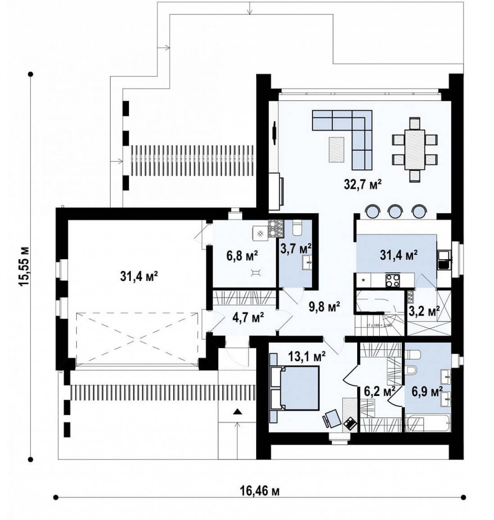 Подшива свесов кровли и террасы/углы дома – строганная доска камерной сушки, окрашенная на производстве, под цвет дома