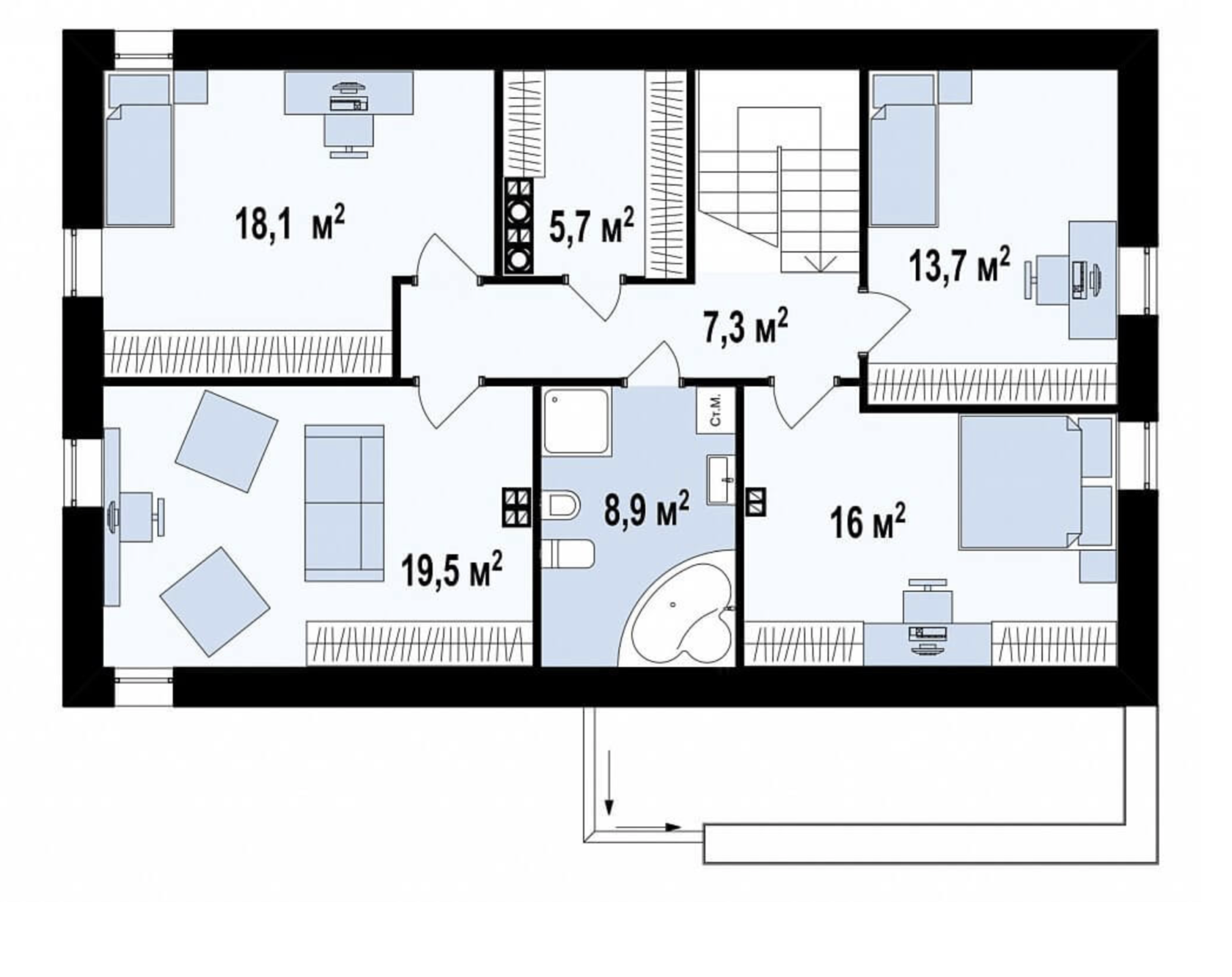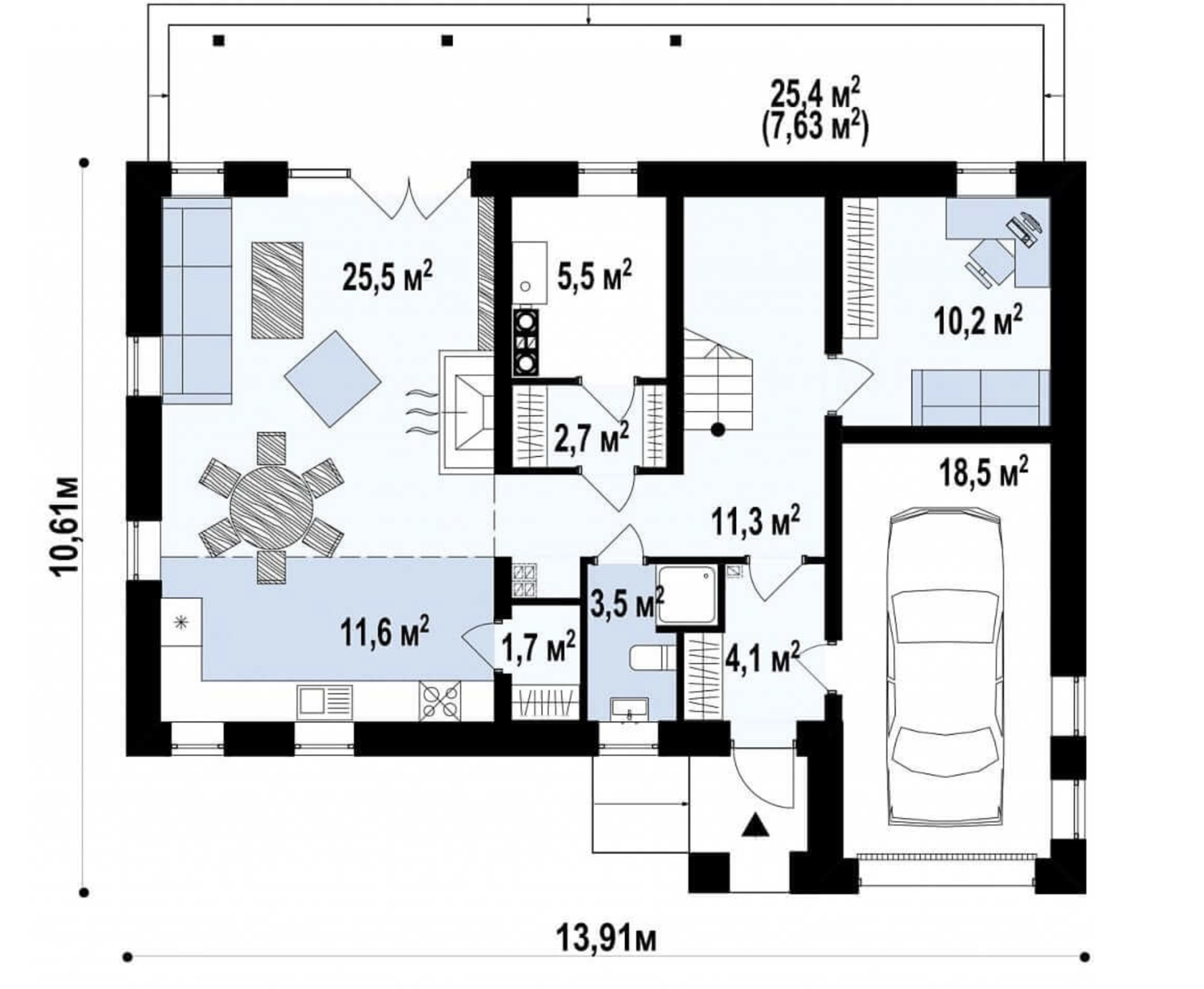 Большая кухня-гостиная, пять спален, два санузла, терраса, гараж.