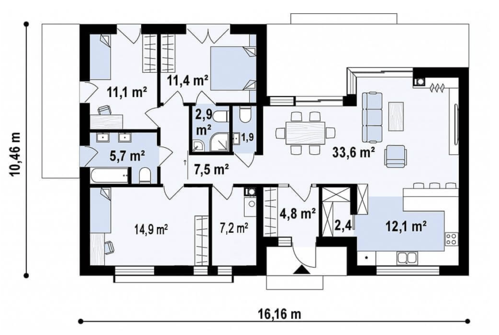 Большая кухня-гостиная, три спальни, три санузла, терраса.