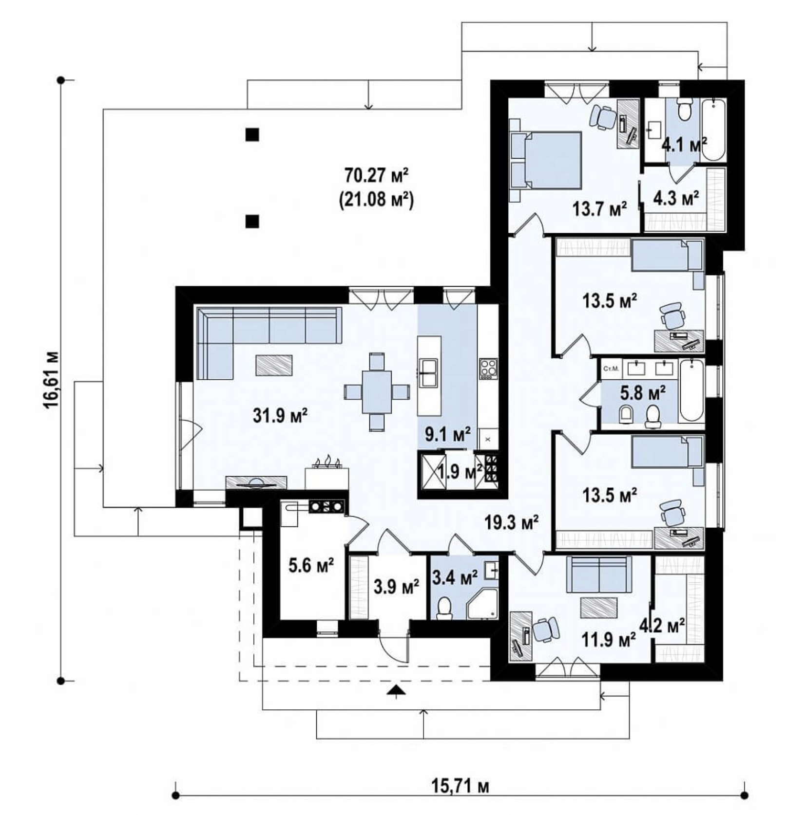 Большая кухня-гостиная, четыре спальни, три санузла, терраса.