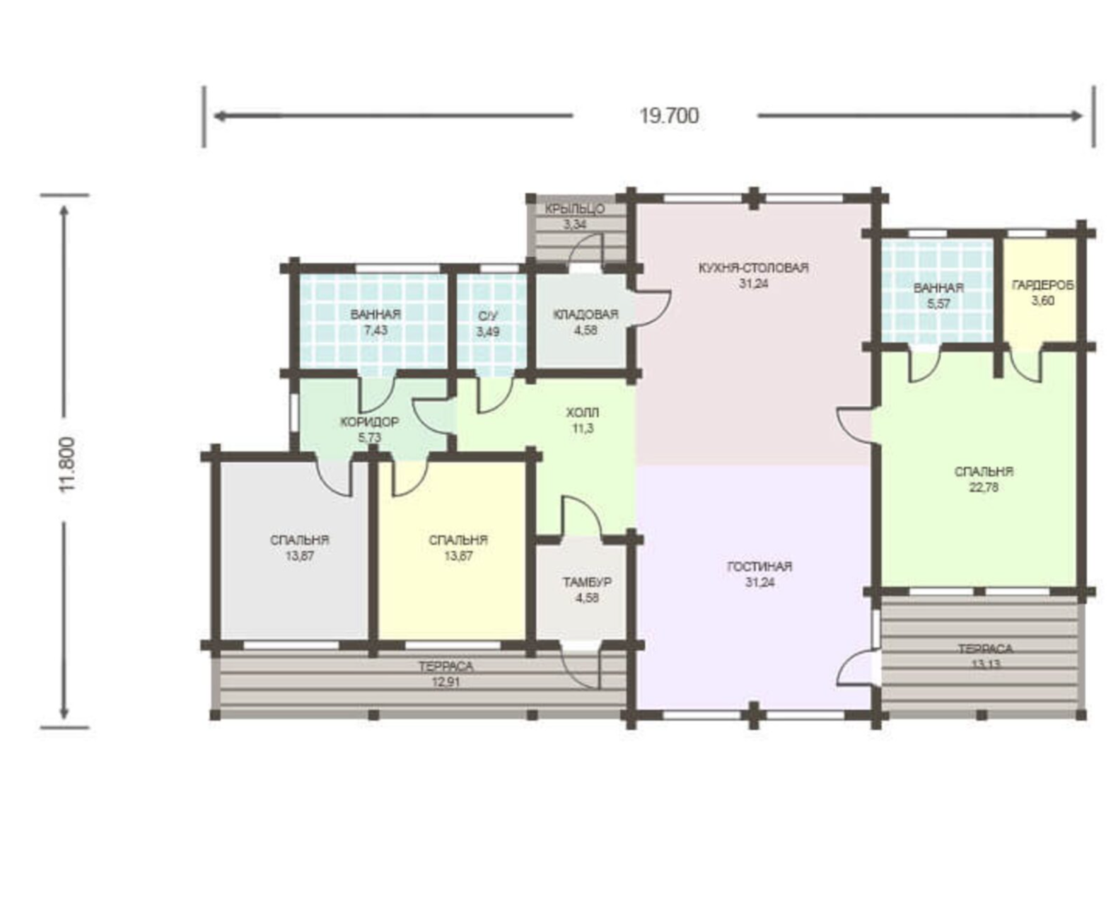Карнизные свесы/наличники оконных и дверных проемов/углы дома – строганная доска камерной сушки, окрашенная на производстве, под цвет дома