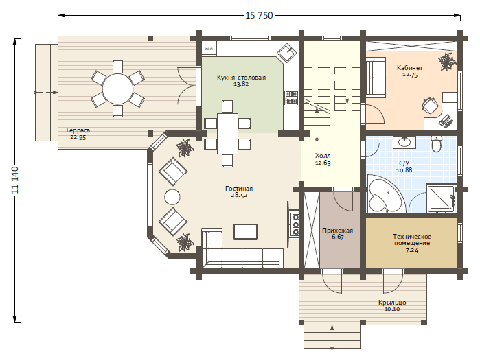 Большая кухня-гостиная, четыре спальни, кабинет на первом этаже, два санузла, терраса, балкон.