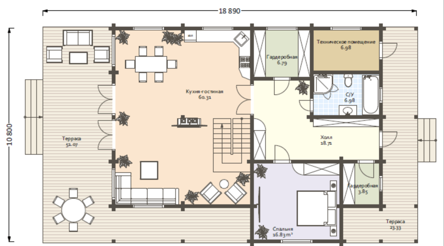 Каркас, перила из сухой строганной доски, пол - террасная доска, из хвойных пород (ель, сосна), с рифлёной поверхностью «Вельвет», исключающей скольжение, балясины и заходные столбы заводские, точёные, камерной сушки