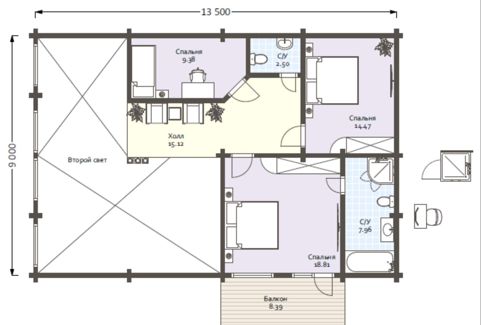Стропила – составные балки из строганной доски камерной сушки сечением 45x290 мм (195+95), шаг 580 мм