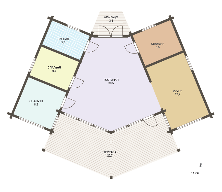 Каркас, перила из сухой строганной доски, пол - террасная доска, из хвойных пород (ель, сосна), с рифлёной поверхностью «Вельвет», исключающей скольжение, балясины и заходные столбы заводские, точёные, камерной сушки