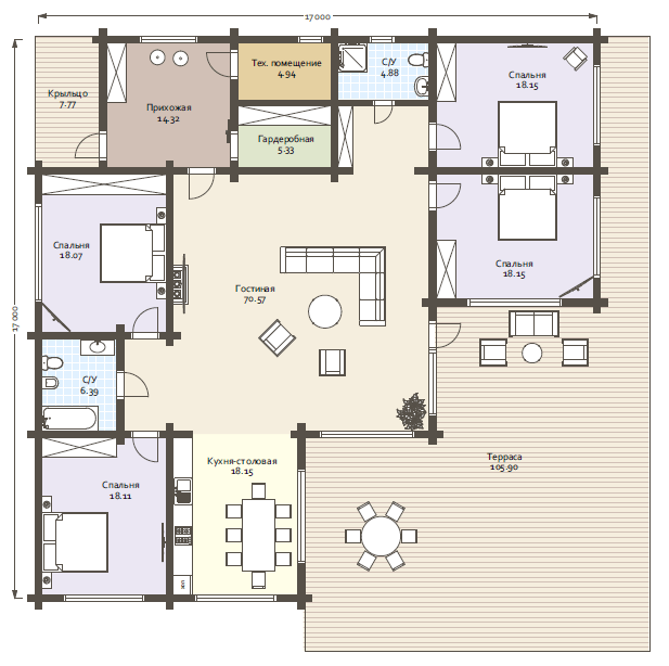 Каркас, перила из сухой строганной доски, пол - террасная доска, из хвойных пород (ель, сосна), с рифлёной поверхностью «Вельвет», исключающей скольжение, балясины и заходные столбы заводские, точёные, камерной сушки