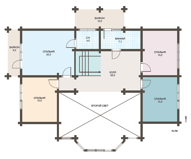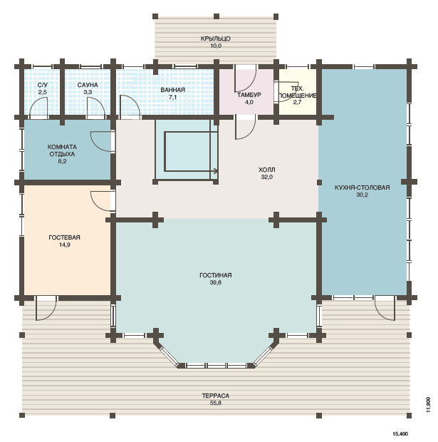 Карнизные свесы/наличники оконных и дверных проемов/углы дома – строганная доска камерной сушки, окрашенная на производстве, под цвет дома