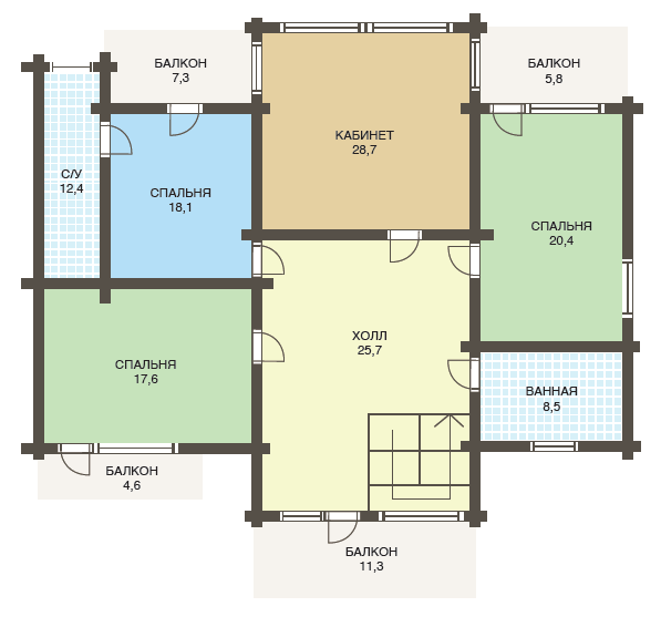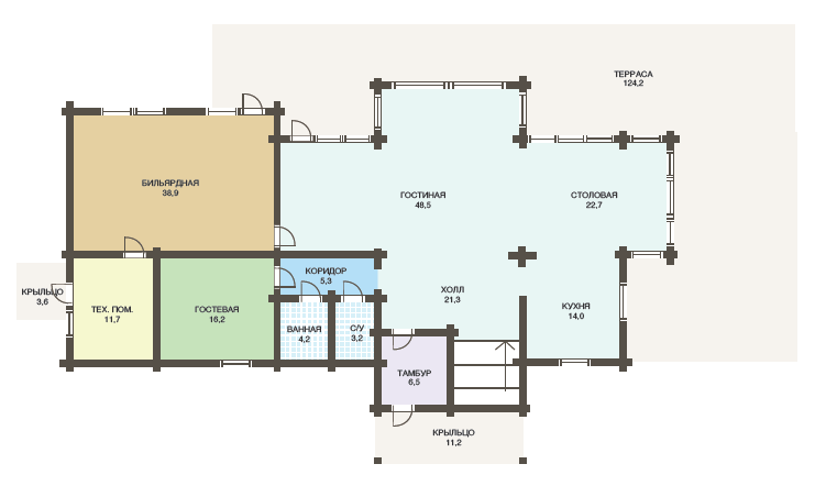 Карнизные свесы/наличники оконных и дверных проемов/углы дома – строганная доска камерной сушки, окрашенная на производстве, под цвет дома