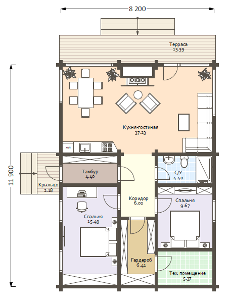 Большая кухня-гостиная, две спальни, один или два санузла, терраса, камин.
