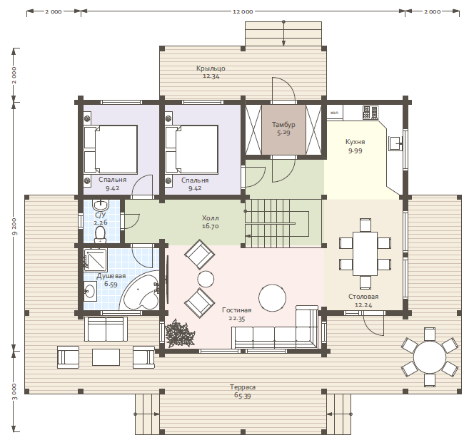 Каркас, перила из сухой строганной доски, пол - террасная доска, из хвойных пород (ель, сосна), с рифлёной поверхностью «Вельвет», исключающей скольжение, балясины и заходные столбы заводские, точёные, камерной сушки