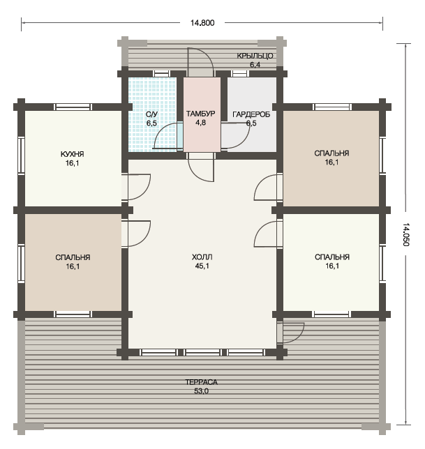 Каркас, перила из сухой строганной доски, пол - террасная доска, из хвойных пород (ель, сосна), с рифлёной поверхностью «Вельвет», исключающей скольжение, балясины и заходные столбы заводские, точёные, камерной сушки