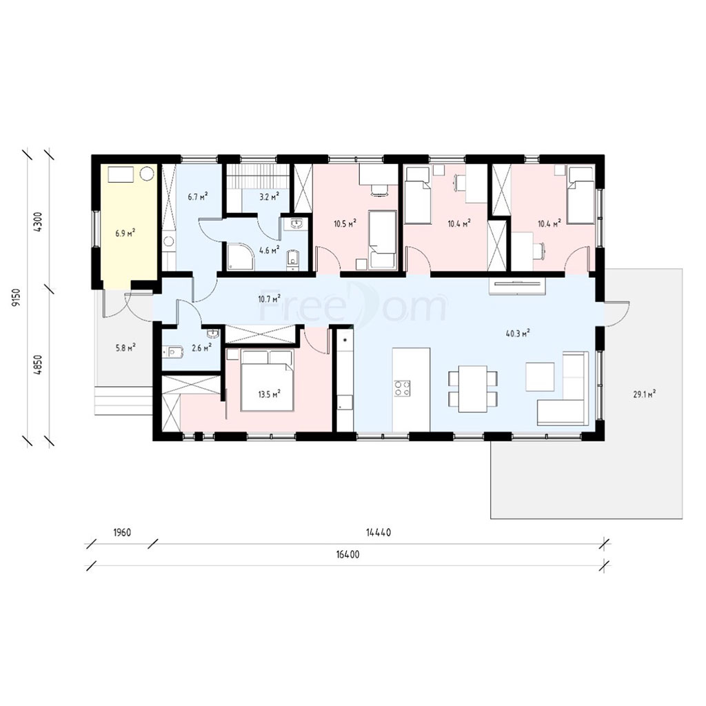 Большая кухня-гостиная, четыре спальни, два санузла, терраса, сауна.