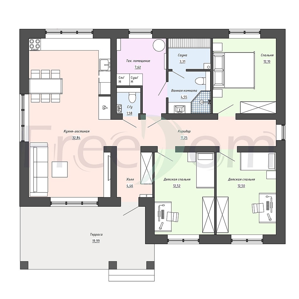 Большая кухня-гостиная, три спальни, два санузла, терраса.